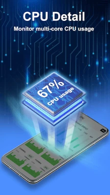 CPU Monitor feature can monitor the CPU usage and frequency, analyze the history data, and clock speed for each core, provide efficient cooler tips to prevent phone from overheating.